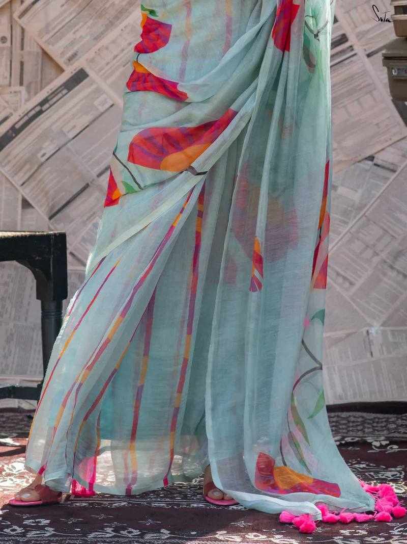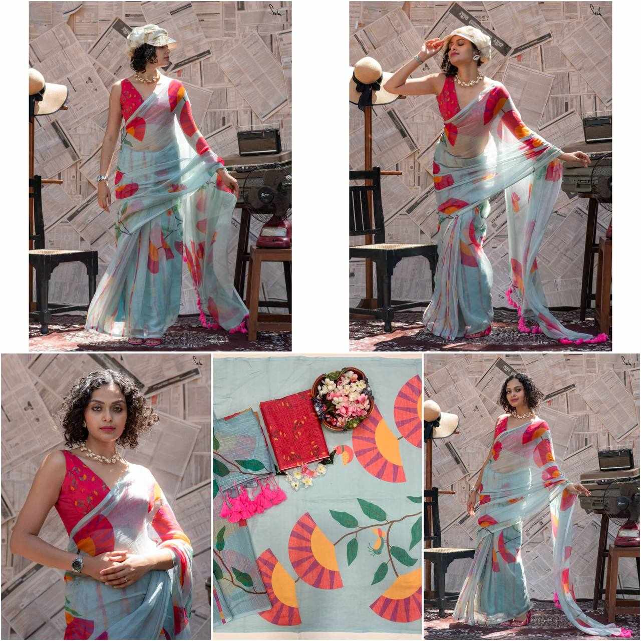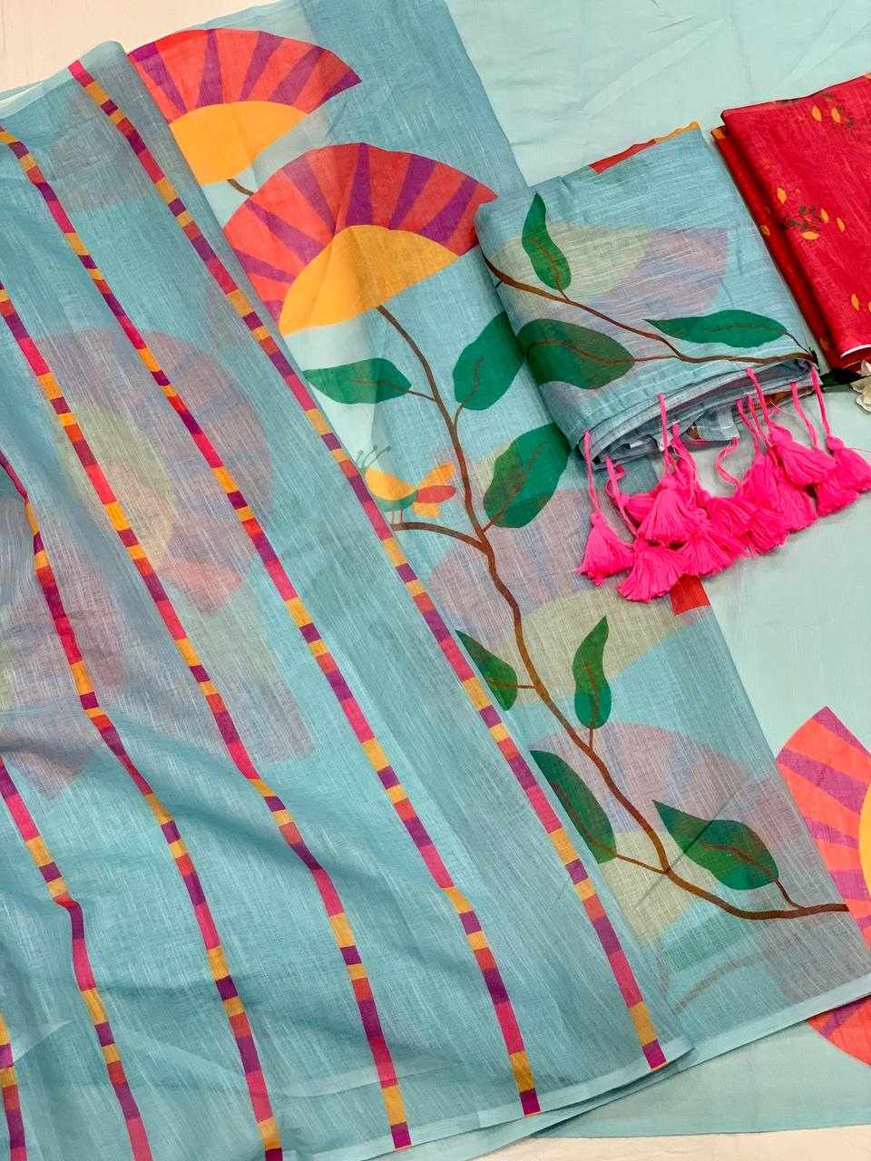 Saree Fabric: Premium Linen Cotton with beautiful digital print and elegant handmade cotton tassels