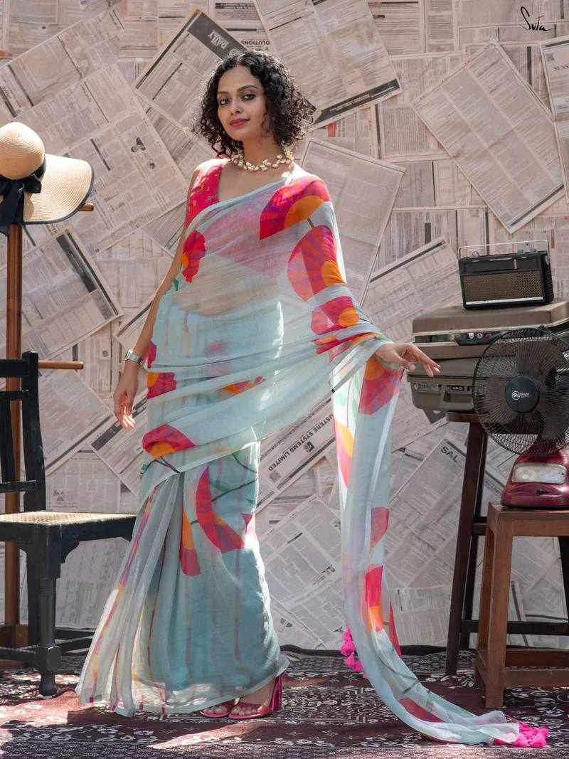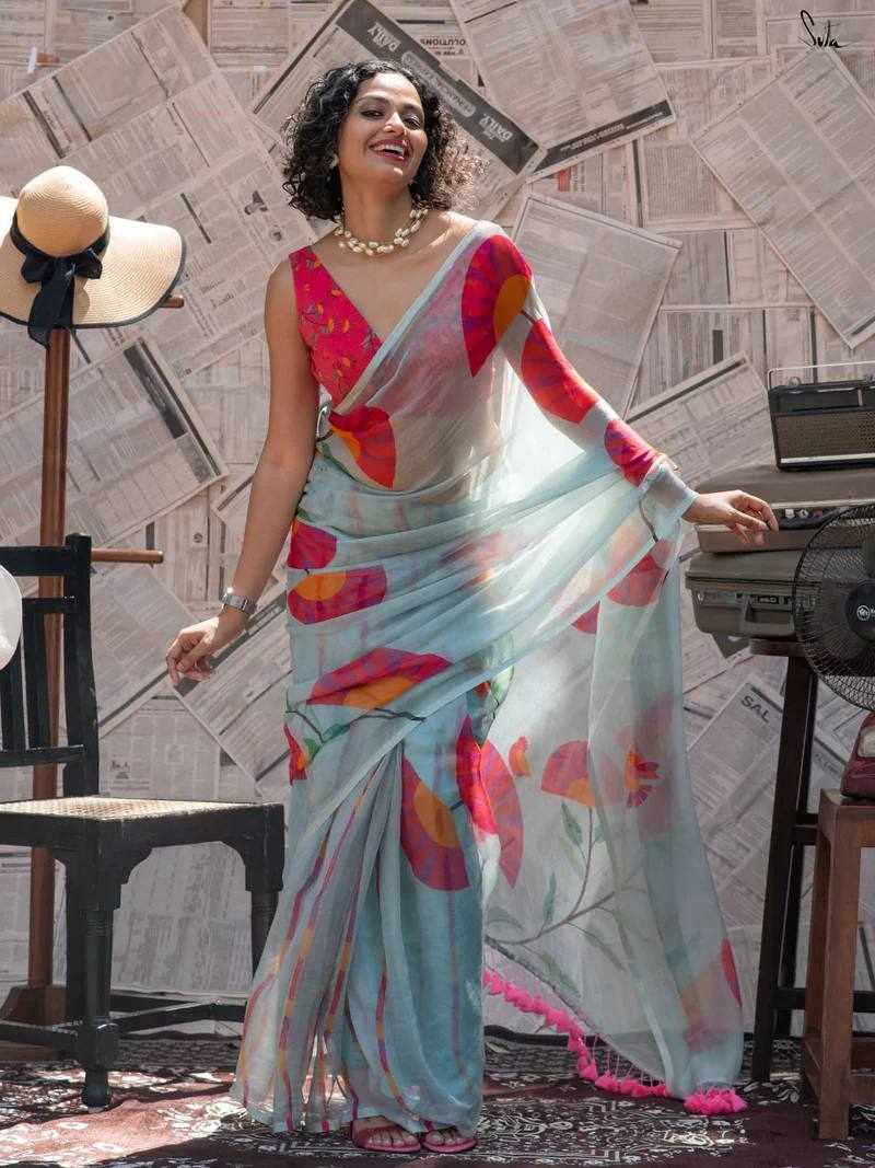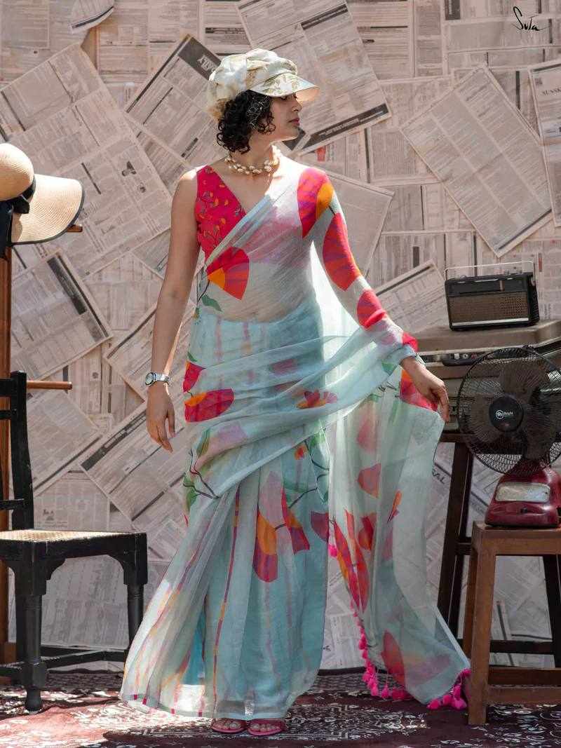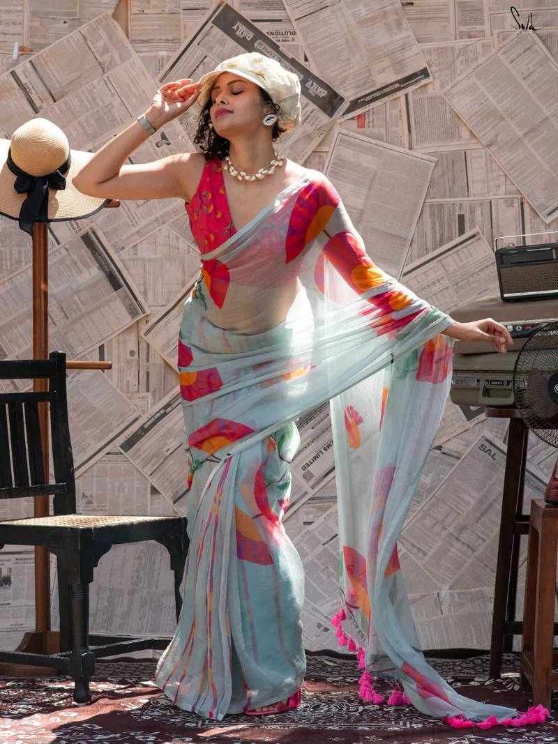 Saree Fabric: Premium Linen Cotton with beautiful digital print and elegant handmade cotton tassels